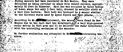 He said that the informant, whose identity was censored in the memo, claimed the saucers had been found in New Mexico ‘due to the fact that the Government has a very high-powered radar set-up in that area and it is believed the radar interferes with the controlling mechanism of the saucers’. He then stated that the special agent did not attempt to investigate further.